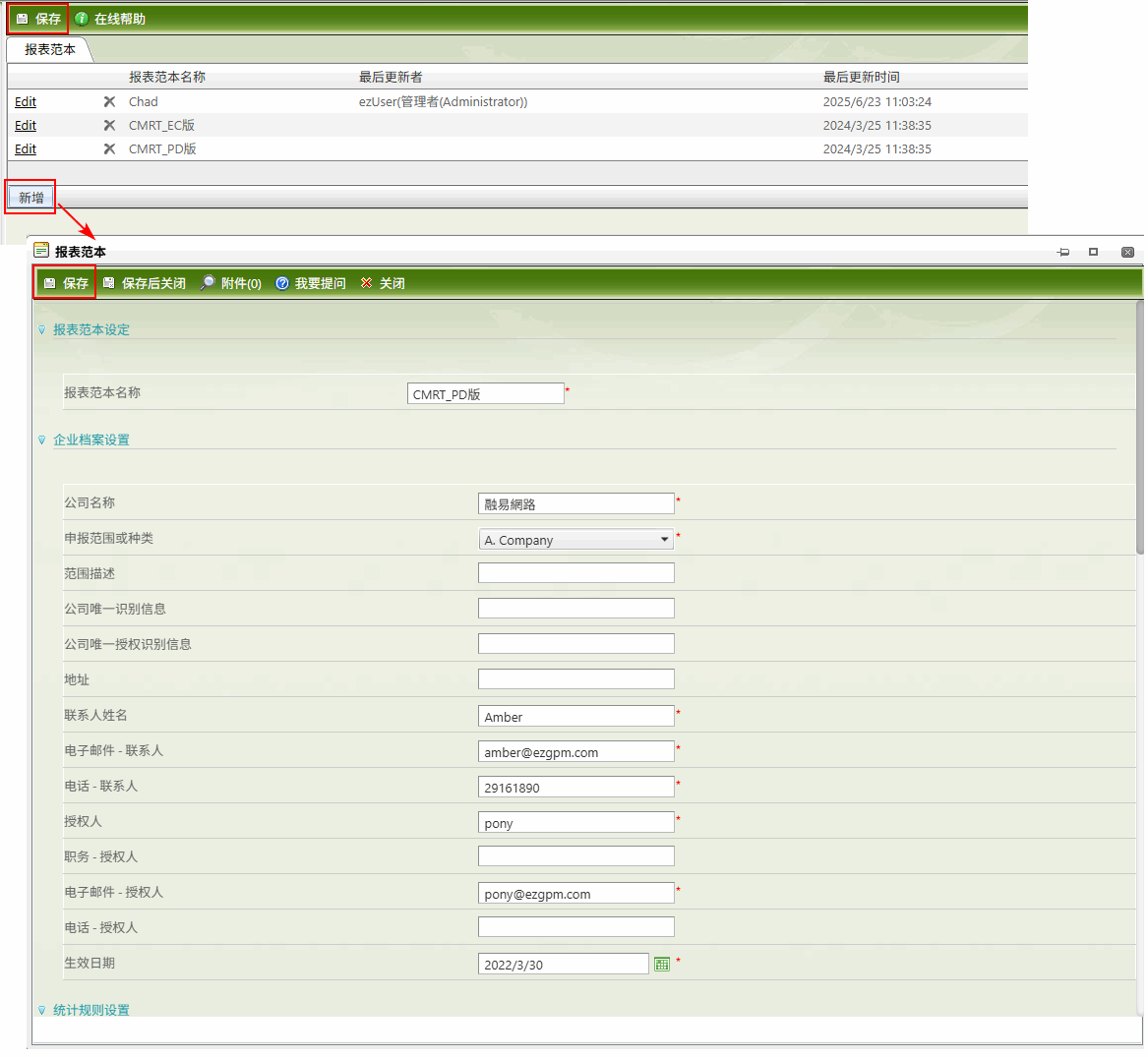键将资料存盘(请注意!有红色*为必填字段)。 - 下方可切换CMRT或EMRT页签来进行设置。
