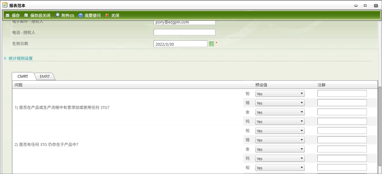 设定[责任矿产符合分析] 的报表模板内容,可针对公司层级以及隶属厂区设置CMRT/EMRT模版Declatarion的统计规则,包含:企业档案和统计规则(为CMRT/EMRT模版(Declaration)问卷的问题回复),设定方式如下:
